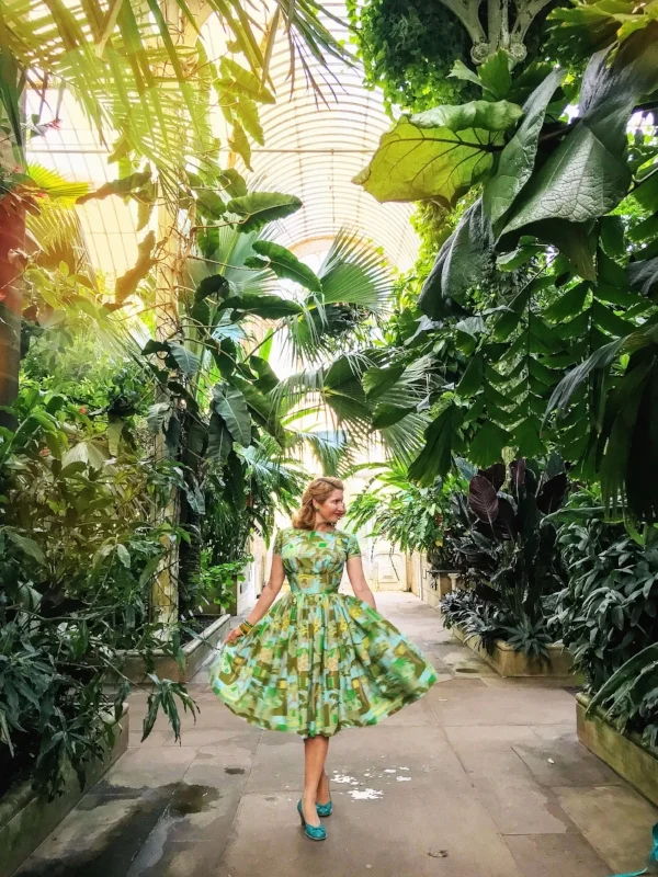 It seemed fitting to debut my latest make, in a tropical-themed novelty print, on the final late opening of the season. And a delight to find the great glasshouse empty, silent except for our footsteps and the droplets of water splashing to the floor from lofty palms. The golden hour light, diffused through the condensation-fogged, curved glass, just added to the magic.